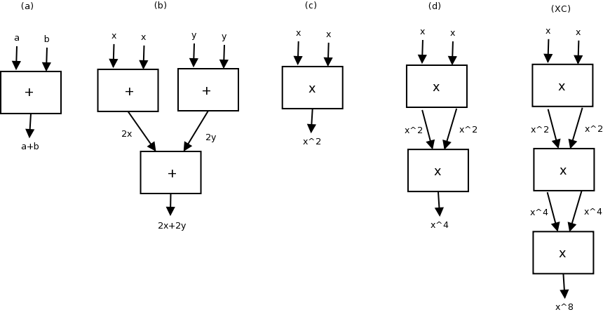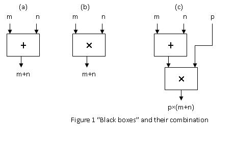 Say we had a "black box," which takes two numbers as input and outputs their sum. See Figure 1(a). Say we had another box capable of multiplying two numbers together. See Figure 1(b). We can connect these boxes together to calculate p × (m + n). See Figure 1(c). Assume we have an unlimited number of these boxes. Show how to connect them together to calculate: