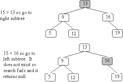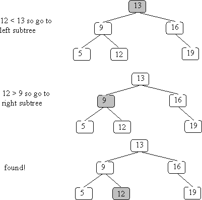 If neither base case holds, a recursive lookup is done on the appropriate subtree. Since all values less than the root's value are in the left subtree and all values greater than the root's value are in the right subtree, there is no point in looking in both subtrees: if the value we're looking for is less than the value in the root, it can only be in the left subtree (and if it is greater than the value in the root, it can only be in the right subtree).
