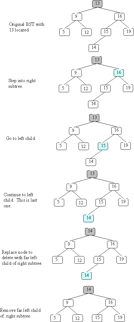 Below is a slightly different example BST; let's see what happens when we delete 13 from that tree.