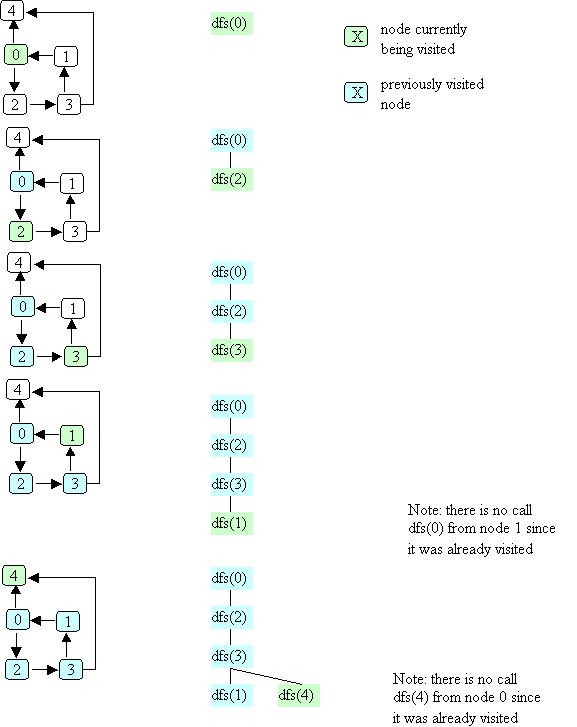 Here's a picture that illustrates the dfs method. In this example, node numbers are used to denote the nodes themselves (i.e., the call dfs(0) really means that the dfs method is called with a pointer to the node labeled 0). Two different colors are used to indicate the node currently being visited and the previously visited node.