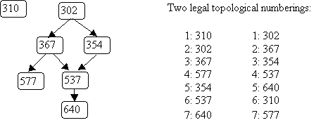 Topological numbering can be used to find the order in which to take the classes (so that all prereqs are satisfied first). The goal is to assign numbers to nodes so that for every edge j → k, the number assigned to j is less than the number assigned to k. A topological numbering of the prerequisites graph would tell you one legal order in which to take the CS courses. For example: