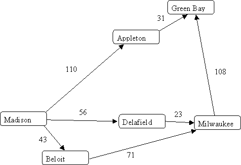 This technique only works in unweighted graphs (i.e., in graphs in which all edges are assumed to have length 1). An interesting problem is how to find shortest paths in a weighted graph; i.e., given a "start" node n, to find, for each other node m, the path from n to m for which the sum of the weights on the edges is minimal (assuming that no edge has a negative weight). For example, in the following graph, nodes represent cities, edges represent highways, and the weights on the edges represent distances (the length of the highway between the two cities). Breadth-first search can only tell you which route from Madison to Green Bay goes through the fewest other cities; it cannot tell you which route is the shortest.
