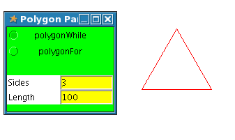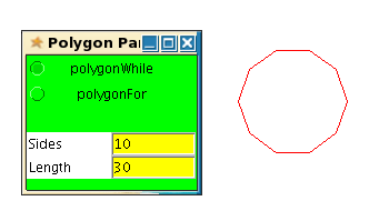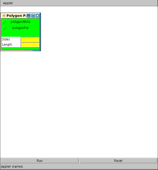 Iteration in Turtle WorldYou are all probably too young to remember the Turtle program in old Macs, so Welcome to Turtle World! A turtle is basically a very small cursor (you won't even be able to see it) that can draw lines. Today we'll be using a turtle to draw polygons and polygon flowers. The basic layout of the application, as you can see below, is one pane for specifing parameters to the turtle and the other pane to actually see what the turtle draws. The application works similarly to the maze application in that to run your program (once you have written it) you press the run button at the bottom of the screen. To then reset the window to be blank again, press the reset button.