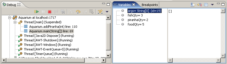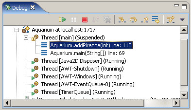 In more complicated examples than this tutorial, the call stack can help you understand the complicated way in which methods call each other. It also gives you a convenient way to look at variables local to each method in the stack. Click on the method's entry in the Debug pane, and the Variables pane will switch to display the variables of that method.