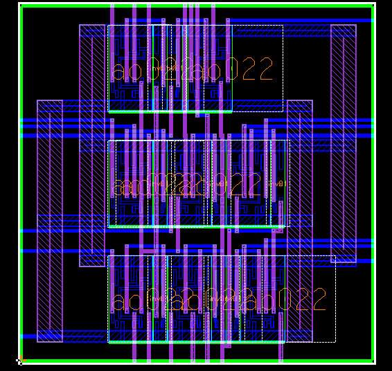layout of an 8-bit 2-by-1 mux using the scn08hp library of standard cells.
