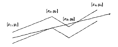 Each pipe component consists of many straight pipes connected tightly together. For the programming purposes, the company developed the description of each component as a sequence of points [x1; y1], [x2; y2], . . ., [xn; yn], where x1 < x2 < . . . xn . These are the upper points of the pipe contour. The bottom points of the pipe contour consist of points with y-coordinate decreased by 1. To each upper point [xi; yi] there is a corresponding bottom point [xi; (yi)-1] (see picture above). The company wants to find, for each pipe component, the point with maximal x-coordinate that the light will reach. The light is emitted by a segment source with endpoints [x1; (y1)-1] and [x1; y1] (endpoints are emitting light too). Assume that the light is not bent at the pipe bent points and the bent points do not stop the light beam.