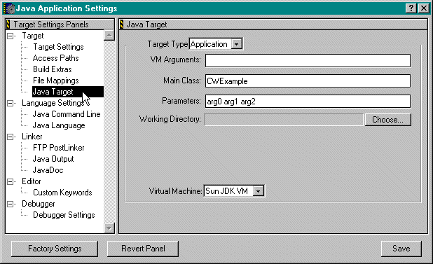 From there, you choose the "Java Target" option, from which you may edit either the main class or the command line arguments. You should put the name of the class in Main Class text field. Make sure you do not include the ".class" extension or the ".java" extension. Command line arguments should be typed in the "Parameters" section.