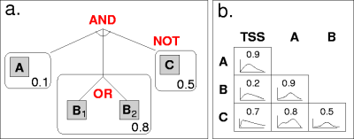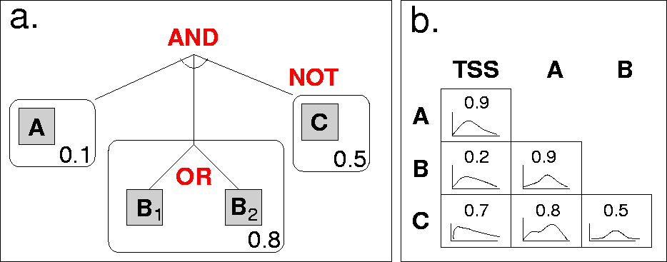 An example CRM model structure is shown in Figure 1. On the left (a), we see an example model structure: A conjuction of binding sites, each a disjunction of motifs. Binding sites also have a strand preference (a single number representing the probability that binding occurs on the template strand). Binding sites may be negated.