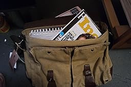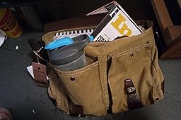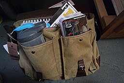 But what I really like are the materials. The canvas is thick and has a heavy weave. The leather, though only synthetic, is thick and feels very nice. It has a nice pressed pattern, color and thick stitching. It looks like something that famous archeologist would take on his adventures to look for treasure.