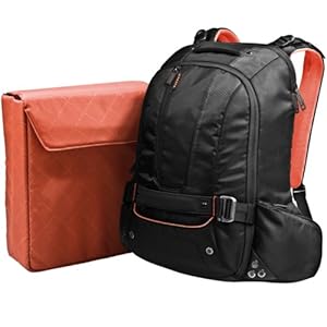 Everki created the Beacon with the serious gamer in mind. Its main front compartment opens to reveal a fully removable padded sleeve large enough to comfortably fit a Wii, Xbox 360, or PS3 gaming console. The sleeve fits neatly into its compartment with room left over for documents and a few accessories, and the bag features a clever buckle system that allows for partial or full 180 degree opening of the compartment for easy loading. Additional interior pockets facilitate tidy organization of items like cables, tools, camera, and mouse, and all of the Beacon’s compartments are lined in a warm orange that contrasts stylishly against its black exterior.