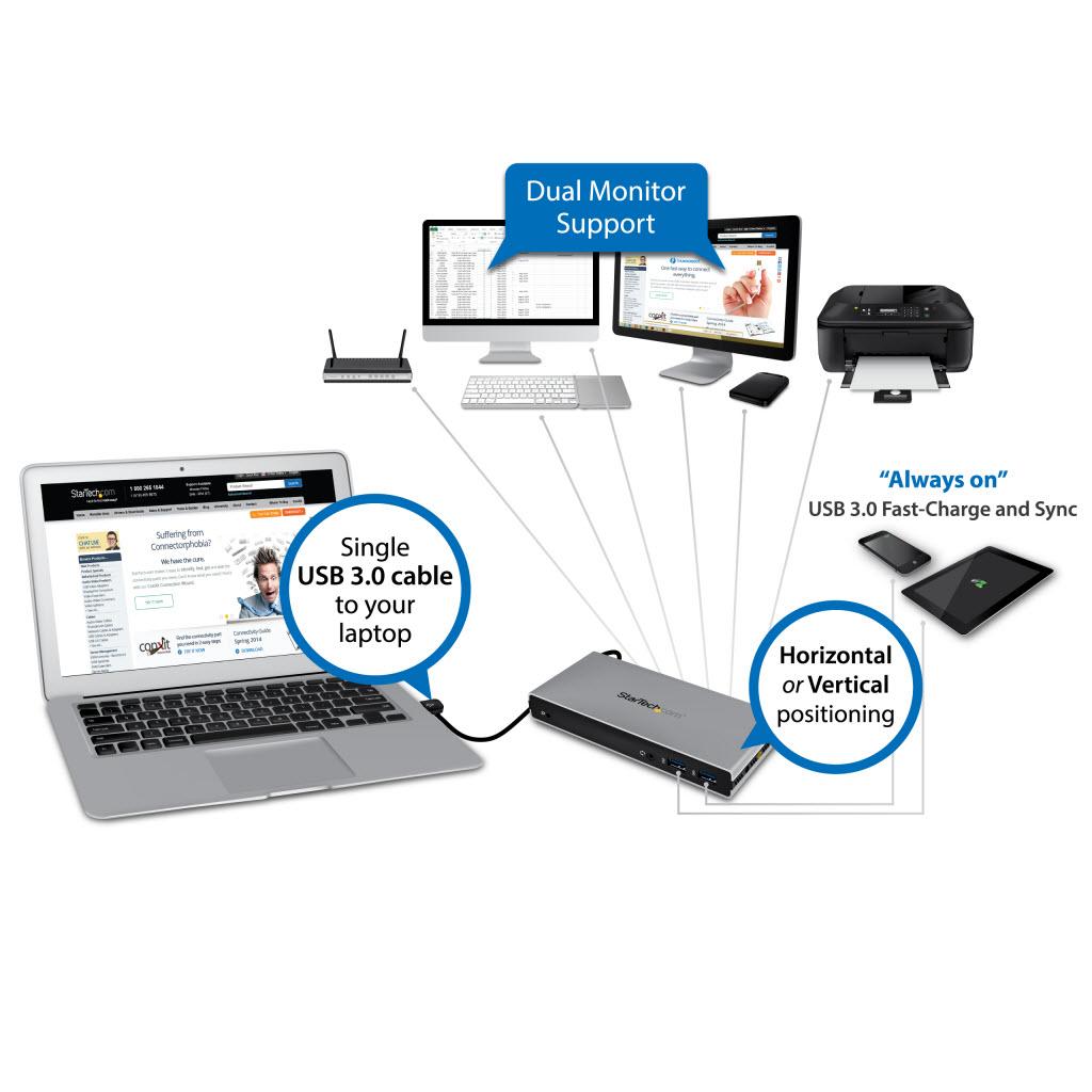 Now, you can easily charge other devices while connected to multiple displays, a Gigabit network, and numerous USB peripherals through the integrated 5-port USB 3.0 controller. Perfect for external USB 3.0 hard drives, the docking station supports UASP-enhanced performance for faster data transfer rates, which means less waiting and more productivity.