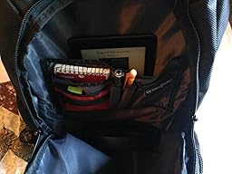 The secondary pocket is highly organized, with plenty of thoughtfully arranged pockets and zippers. I have no problem stowing my Kindle Paperwhite, foldable headphones, pens and other stuff in a logical place. A small zippered compartment is perfect for small USB sticks and other easily lost items. The very front pocket has no organization but is large enough to hold small tablets, kindle, etc.