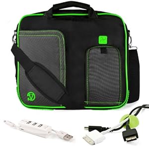 GREEN TRIM BLACK Pindar Durable Water-Resistant Nylon Protective Carrying Case Messenger Shoulder Bag For Acer Aspire TimelineX 14 inch Notebook Laptop Computer + Green Cable Organizer + White 3 Port USB HUB with Micro USB Charger