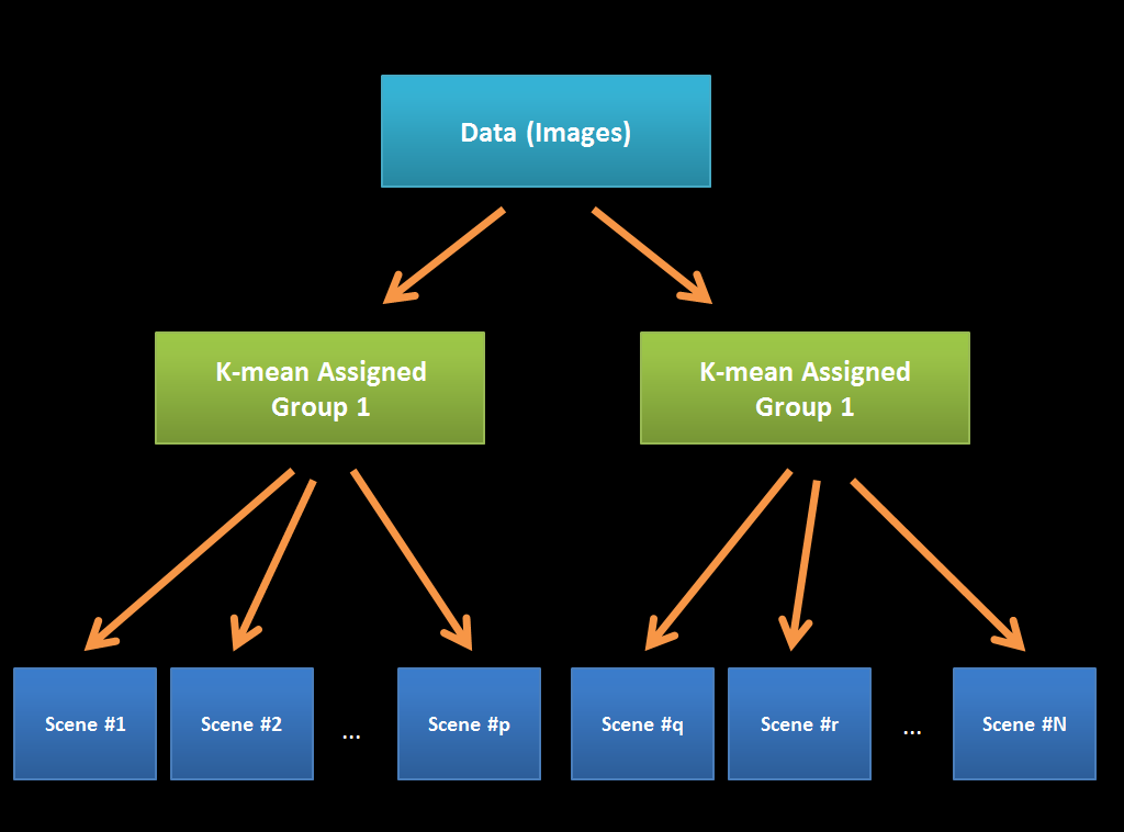 In the first level, instead of supervising and denoting 2 broad groups, we used K-means (k=2) to separate the scenes into 2 groups.