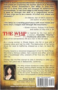 -- Story Circle Book Reviews, Review by Dawn Wink. Charley Parkhurst makes for a compelling main character. The Whip is very well researched (I loved all the historical tid-bits about piano legs, cat-hauling, and the stagecoach business itself), and Kondazian’s novel unfolds cinematically; you can almost feel the sun’s rays and smell the horse sweat. A truly fascinating novel of one woman’s determination and grit in the heart of the Old West.