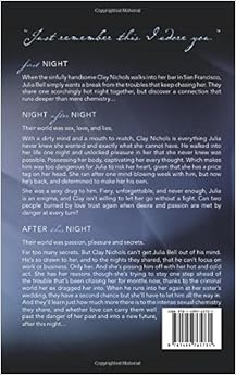 I was hooked from the very first page. I really like having both main characters points of view. I loved all the details. I really like the chemistry between Julia and Clay. I loved that both Clay and Julia are very confident and dominate people. Absolutely loved the humor. This is a really great prequel to Night After Night. It was a very fast read but I loved it and I would highly recommend this novella.