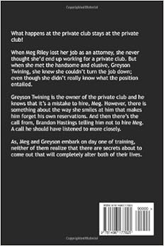 I loved this book! Meg is out of a job and goes to an interview for a "bartending" job at a place called The Private Club where she meets Greyson the owner of the club. At the interview, Meg starts to get a feeling that the job she is applying for is not for bar tending, but something totally different. Greyson knows Brandon Hastings who is her best friend's boyfriend and Meg knows something is not right. She overhears a conversation mentioning Brandon and the club so Meg decides the best way to find out what is going on is to take the job. Greyson is giving her a three day probation period to see if she is right for the job! On her first morning of her "tests" she definitely knows this is not a bar tending job!! She meets her roommate who informs her that her sister worked at the club and disappeared and she is there to find out what happened to her! This book has so many twists and turns and you will just have to read the book for more! There is a cliffhanger but it is a must read book!