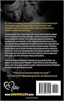 "Quarterback Alex Dare, had it all -- an all-star football career and his choice of willing women -- until injury forces him into early retirement. When he is offered a ground-breaking position with a rival team, he's intrigued, but there's a catch. He'll be working alongside the same woman he callously hurt when she got too close for comfort. But Alex wants Madison. And if there is one thing Alex does well, it's to get what he wants. Can he convince Madison to take a risk and dare to love?"