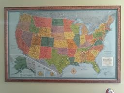 This map is absolutely beautiful and looks awesome framed and mounted. It shows many cities and towns in every state, it also show rivers and relief. It identifies the major mountain ranges, shows most (if not all) National Parks, National Recreation Areas, National Monuments, mountains with their elevation, and much more. I can't express enough at how great this map looks and it was only $10.xx! We've traveled to most of the US and are embarking on a 22 state trip during the summer of 2014 and we found out a pack of 100 map pins is not nearly enough.