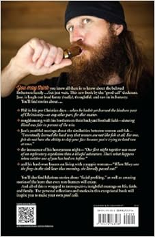 This book is now among the top 10 books I've ever read...and I don't say that lightly. Jase is so funny on TV buy you never truly get a good look at the man that he really is. This book gives you an insight into the whole family, but mostly him and his faith. I have to say, I now admire him a lot more than I did before (and that was a lot). This is a book I would highly recommend that everyone read. Its funny. Its entertaining. It's heartwarming. It will make you think...and it will most certainly leave you knowing beyond a shadow of a doubt that there is more to those Robertson men than their beards and hunting.