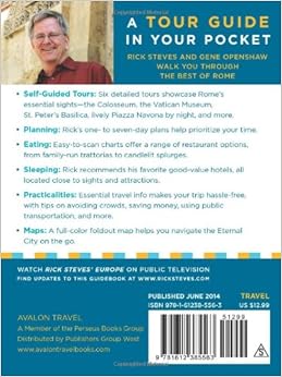 You've seen his programs on PBS. His guide books are like that. Funny, easy and full of helpful tips. This pocket sized book is just right for carrying on bus or metro and even comes with a glued-on map of the center of Rome. Book has rating system for must see items(3 triangles), i.e. Colosseum, Vatican Museum, etc. to "worthwhile only if you can make it" (1 triangle) like Capitol Hill, Arch of Constantine,... Spanish Steps at Piazza di Spagna and Trevi Fountain are included in this "take it or leave it" category because they are teen hangouts. However, they are included in the roughly 1 mi. "Night Walk Across Rome" which is a really nice walk through the neighborhoods. There are ancient structures everywhere you look if you are in the center of town so walking is best. Public transit (buses, metro trains) is good and costs 1 euro with a 75 min. transfer. Book also has restaurant recommendations by neighborhoods, a real plus.