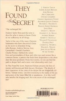 "The exchanged life." Hudson Taylor first used the term to describe what it means to know Christ as our sufficiency in all things. Taylor is but one of the many Christian luminaries who have discovered Christ as the secret to abundant living. John Bunyan, Andrew Murray, Amy Carmichael, Oswald Chambers, Charles Finney-behind the varied lives and personalities of these and other men and women lies a common theme, a pattern that leads from desperation to the abundant life Jesus promised. From their stories, we too can find the path to deeper faith and a more vital relationship with God. In They Found the Secret, Raymond Edman presents the lives of twenty well-known and little-known Christians. "The details of their experience of the crisis of the deeper life are delightfully different," Edman writes, "yet their testimony to the reality of the joy and power of the Spirit-filled life is unanimous . . . It is [the Lord] who satisfies the longing soul. He is the secret of the exchanged life!"