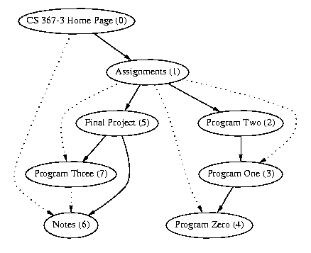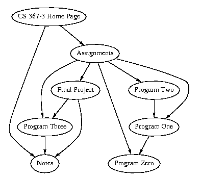 For example, from the CS 367-3 Home Page we might, click on Assignments then on Program Two, then on Program One, then on Program Zero. We realize we are looking for something else, so we back track to a point where we have further options, in this case, Assignments, and then proceed to Final Project, to Notes and then back to Final Project, and then finally to Program Three where we find some information on AVL trees. This type of traversal should seem familiar --- it is an example of depth-first search.