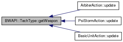 Returns the corresponding weapon for this tech type, or TechTypes::None if no corresponding weapon exists. For example, TechTypes::Dark_Swarm.getWeapon() will return a pointer to WeaponTypes::Dark_Swarm.