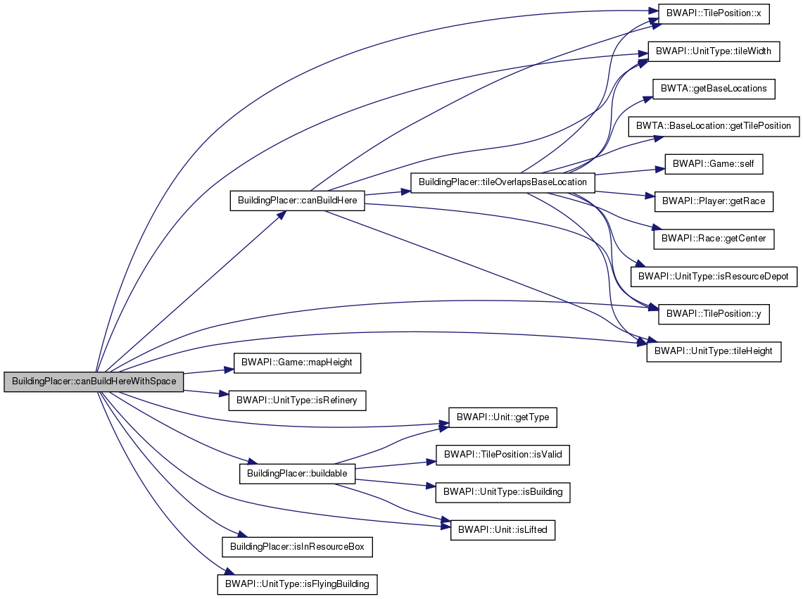 | bool | canBuildHereWithSpace (BWAPI::TilePosition position, const Building &b, int buildDist, bool horizontalOnly=false) const |