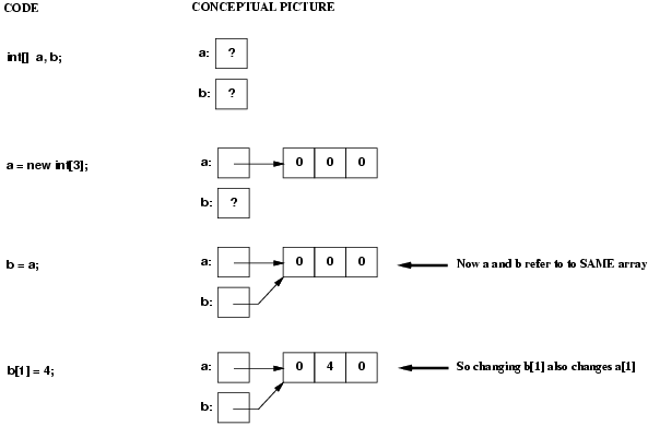 An important consequence of the fact that non-primitive types are really pointers is that assigning from one variable to another can cause aliasing (two different names refer to the same object). For example:
