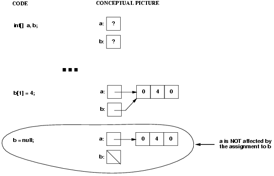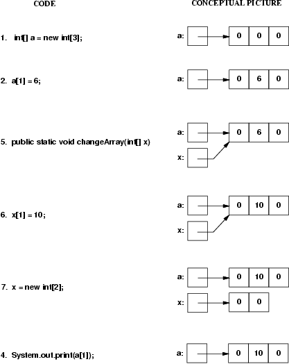 Note that the method call causes A and X to be aliases (they both point to the same array). Therefore, the assignment X[1] = 10 changes both X[1] and A[1]. However, the assignment X = new int[2] only changes X, not A, so when the call to changeArray finishes, the value of A[1] is still 10, not 0.