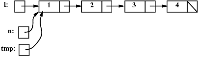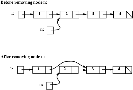 Note that the fact that n's next field is still pointing to a node in the list doesn't matter -- n has been removed from the list, because it cannot be reached from l. It should be clear that in order to implement the remove operation, we first need to have a pointer to the node before node n (because that node's next field has to be changed). The only way to get to that node is to start at the beginning of the list. We want to keep moving along the list as long as the current node's next field is not pointing to node n. Here's the appropriate code:
