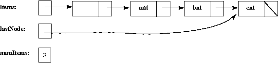 Here's a picture of the "ant, bat, cat" list, when the implementation includes a lastNode pointer:
