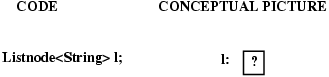 To understand this better, consider writing code to create a linked list of Strings with two nodes, containing "ant" and "bat", respectively, pointed to by a variable named l. First we need to declare variable l; here's the declaration together with a picture showing what we have so far: