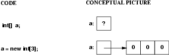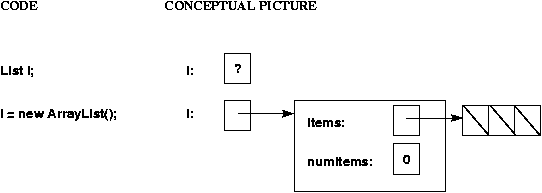 Remember that class objects are also reference types. For example, if you declare a variable of type List, you only get space for a pointer to a list; no actual list exists until you use "new". This is illustrated below, assuming the array implementation of lists and assuming that the ArrauList constructor initializes the items array to be of size 3. Note that because it is an array of Objects, each array element is (automatically) initialized to null (shown using a diagonal line in the picture).
