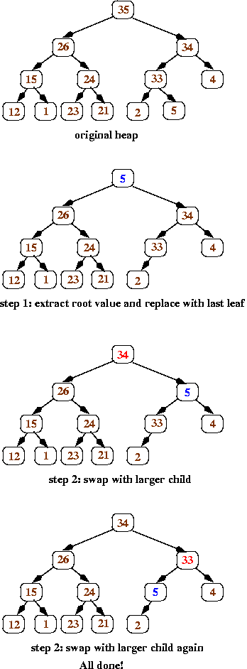 Here's a series of pictures to illustrate the removeMax operation applied to the heap shown above.