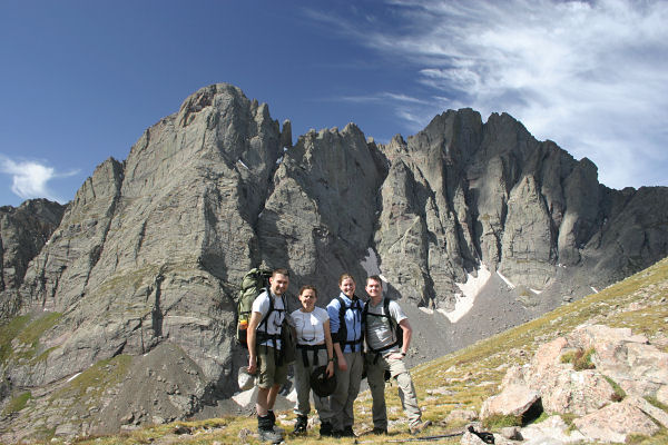 Todd, Heather, Amanda and Dave at the saddle below Humboldt Peak with the Crestone Needle across the valley behind us.