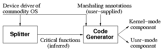 Hardware-based isolation. Several architectures use hardware-based mechanisms to isolate faults in kernel extensions, in particular device drivers. These include Nooks [22] and VMM-based mechanisms [11,15] that run each driver in its own protection domain. Microdrivers also use hardware, in particular, the process boundary, to isolate large parts (but not the entire) device driver. However, microdrivers can potentially perform better than these hardware-based isolation mechanisms because performance-critical code resides and executes in kernel address-space. In addition, microdrivers also reduce the amount of code running in the kernel. Microkernels (e.g., [16,23,25]) also use the process boundary to isolate device drivers, and explicitly aim to reduce the amount of code executing with kernel privilege, but do so at the cost of reduced performance. Microdrivers offer poorer isolation than microkernels, but promise better performance.