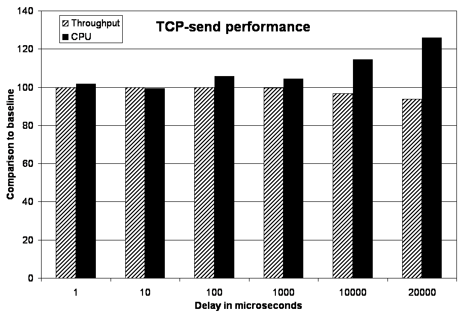 The kernel-mode component of our e1000 microdriver contains just 25% of the code of the entire microdriver. In our experiments, we ran the e1000 microdriver on a dual-core 3Ghz Pentium-D machine running Linux-2.6.18. We measured network throughput and CPU utilization using netperf to send TCP packets (results for TCP/receive were similar and are omitted). We used buffers of size 256KB on both the sending and receiving side and trasmitted 32KB messages. Figure 4 compares the network throughput and CPU utilization of the e1000 microdriver (with different values for delays) against a traditional e1000 device driver running under the same conditions. We observed that the microdriver has negligible overheads for network throughput and CPU utilization for delays under 10 microseconds. Even with a 20 millisecond delay (60,000,000 machine cycles) we only observed a 6.3% drop in network throughput and 26% increase in CPU utilization. These results show that microdrivers reduce the amount of driver code running in the kernel without affecting common-case performance, and are thus a viable alternative to traditional device drivers.