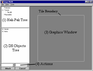 This window displays the currently active tile or placeable. To view/edit a different object, select it from the Hak Pak Tree (1).
