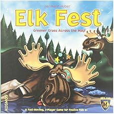 Part of the Kosmos two-player series, Elk Fest or Elchfest is a two player dexterity game in which players attempt to navigate their moose across a river along a series of stones. Players take turns flicking 2 stones, represented by disks, and moving their moose along said stones. Care must be taken when moving ones moose as if the front and back hooves of the moose do not rest atop of the stones the players turn immediately ends, the moose is returned to its previous position, and the opposing player may flick 3 stones. The winner is the first person to move their moose to the opposing river bank! Two elk (Jule and Ole) stare at each other across a river. Longing for the greener grass where the other elk is, they set out to beat each other to the opposite bank! In Elk Fest, move your elk to the other bank by flicking wooden disks across the table and balancing ... read more
